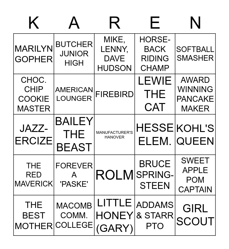 This bingo card has 34 words: CONCERT GOER, R.O. YOUTH VOLUN-TEER, "MS. KAREN", SKIING SNOW BUNNY, KOHL'S QUEEN, CHOC. CHIP COOKIE MASTER, AMERICAN LOUNGER, MANUFACTURER'S HANOVER, LEWIE THE CAT, GIRL SCOUT, JAZZ- ERCIZE, BUTCHER JUNIOR HIGH, ADDAMS & STARR PTO, WALKER DRIVE, THE RED MAVERICK, BAILEY THE BEAST, ROLM, HESSE ELEM., SWEET APPLE POM CAPTAIN, THE BEST MOTHER, MACOMB COMM. COLLEGE, LITTLE HONEY (GARY), HORSE-BACK RIDING CHAMP, AWARD WINNING PANCAKE MAKER, HAPPY PLACE FORT WALTON, FOREVER A 'PASKE', MIKE, LENNY, DAVE HUDSON, ROGGE STREET, SOFTBALL SMASHER, MARILYN GOPHER, MRS. GRAY HELPER, FIREBIRD, BRUCE SPRING-STEEN and BFF'S DENISE, PAT, KAREN.