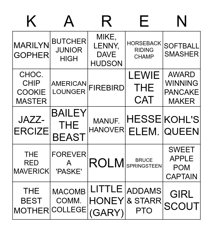 This bingo card has 34 words: CONCERT GOER, R.O. YOUTH VOLUNTEER, "MS. KAREN", SKIING SNOW BUNNY, KOHL'S QUEEN, CHOC. CHIP COOKIE MASTER, AMERICAN LOUNGER, MANUF. HANOVER, LEWIE THE CAT, GIRL SCOUT, JAZZ- ERCIZE, BUTCHER JUNIOR HIGH, ADDAMS & STARR PTO, WALKER DRIVE, THE RED MAVERICK, BAILEY THE BEAST, ROLM, HESSE ELEM., SWEET APPLE POM CAPTAIN, THE BEST MOTHER, MACOMB COMM. COLLEGE, LITTLE HONEY (GARY), HORSEBACK RIDING CHAMP, AWARD WINNING PANCAKE MAKER, HAPPY PLACE FORT WALTON, FOREVER A 'PASKE', MIKE, LENNY, DAVE HUDSON, ROGGE STREET, SOFTBALL SMASHER, MARILYN GOPHER, MRS. GRAY HELPER, FIREBIRD, BRUCE SPRINGSTEEN and BFF'S DENISE, PAT, CAROL, KAREN.