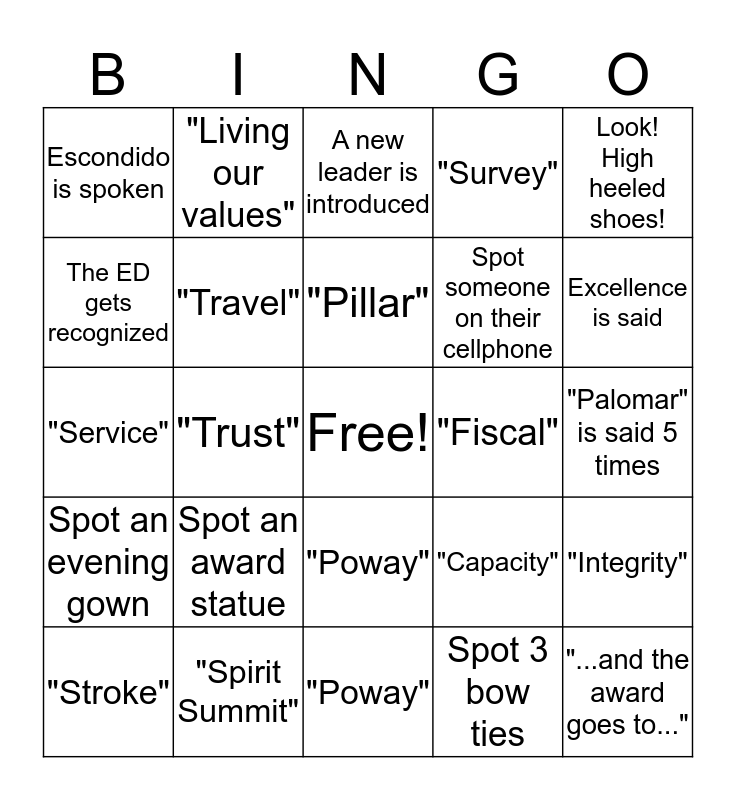 This bingo card has a free space and 24 words: "Stroke", Spot an award statue, "Pillar", Spot 3 bow ties, Look! High heeled shoes!, Escondido is spoken, "Living our values", A new leader is introduced, "Fiscal", "Palomar" is said 5 times, "Service", "Travel", "Capacity", "Integrity", The ED gets recognized, "Spirit Summit", "Poway", "Survey", Excellence is said, Spot an evening gown, "Trust", "Poway", Spot someone on their cellphone and "...and the award goes to...".
