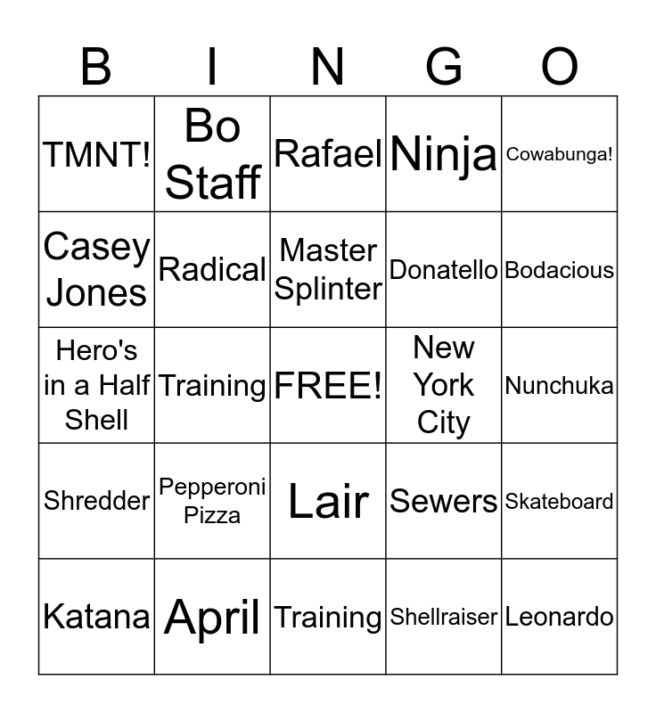 This bingo card has a free space and 24 words: Pepperoni Pizza, April, Master Splinter, Katana, Cowabunga!, TMNT!, Casey Jones, Bo Staff, New York City, Lair, Donatello, Hero's in a Half Shell, Sewers, Skateboard, Radical, Shellraiser, Nunchuka, Rafael, Bodacious, Training, Leonardo, Shredder, Ninja and Training.
