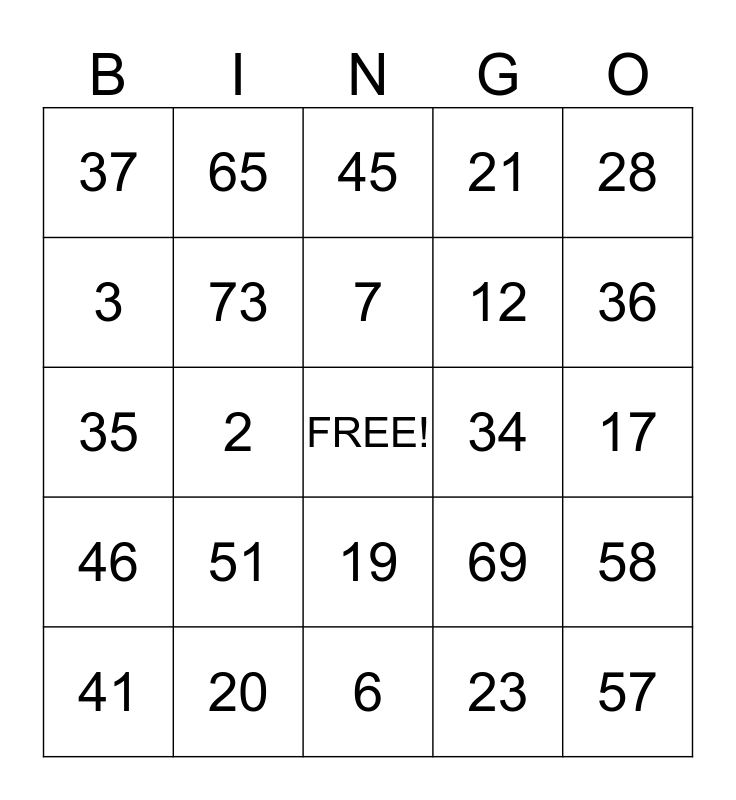 This bingo card has a free space and 24 words: 51, 20, 7, 41, 28, 37, 3, 65, 34, 19, 12, 35, 69, 58, 73, 23, 17, 45, 36, 2, 57, 46, 21 and 6.