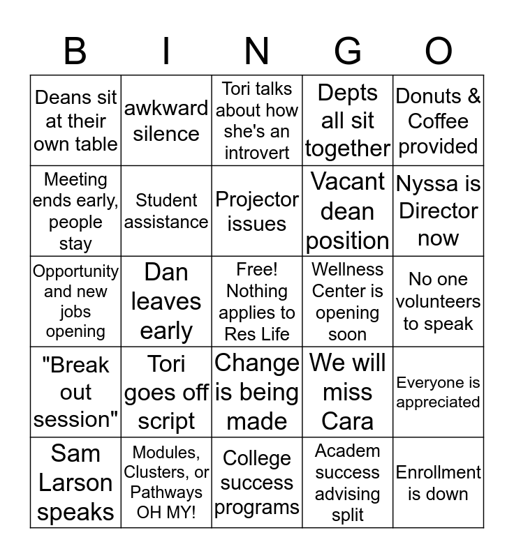 This bingo card has a free space and 24 words: Tori goes off script, Modules, Clusters, or Pathways OH MY!, Projector issues, Sam Larson speaks, Donuts & Coffee provided, Deans sit at their own table, Meeting ends early, people stay, awkward silence, Wellness Center is opening soon, Change is being made, Vacant dean position, Opportunity and new jobs opening, We will miss Cara, Everyone is appreciated, Student assistance, Academ success advising split, No one volunteers to speak, Tori talks about how she's an introvert, Nyssa is Director now, Dan leaves early, Enrollment is down, "Break out session", Depts all sit together and College success programs.