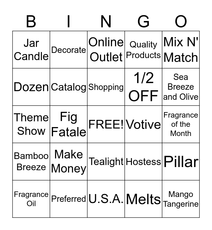 This bingo card has a free space and 24 words: Make Money, Preferred, Shopping, Fragrance Oil, Mix N' Match, Jar Candle, Dozen, Decorate, Votive, Tealight, 1/2 OFF, Theme Show, Hostess, Pillar, Catalog, Melts, Fragrance of the Month, Online Outlet, Sea Breeze and Olive, Fig Fatale, Mango Tangerine, Bamboo Breeze, Quality Products and U.S.A..