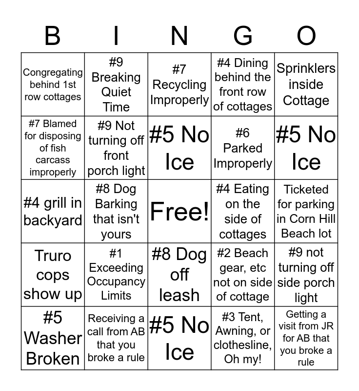 This bingo card has a free space and 24 words: #1 Exceeding Occupancy Limits, Receiving a call from AB that you broke a rule, #5 No Ice, #5 Washer Broken, Sprinklers inside Cottage, Congregating behind 1st row cottages, #7 Blamed for disposing of fish carcass improperly, #9 Breaking Quiet Time, #4 Eating on the side of cottages, #8 Dog off leash, #6 Parked Improperly, #4 grill in backyard, #2 Beach gear, etc not on side of cottage, #9 not turning off side porch light, #9 Not turning off front porch light, #3 Tent, Awning, or clothesline, Oh my!, Ticketed for parking in Corn Hill Beach lot, #7 Recycling Improperly, #5 No Ice, #8 Dog Barking that isn't yours, Getting a visit from JR for AB that you broke a rule, Truro cops show up, #4 Dining behind the front row of cottages and #5 No Ice.