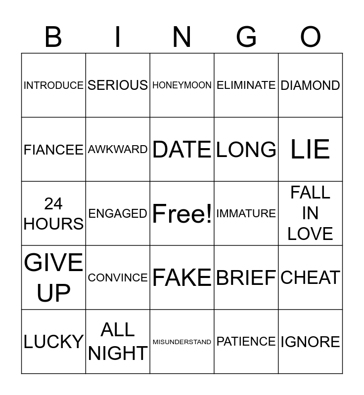 This bingo card has a free space and 37 words: ADMIT, ALONE, ARGUE, AWKWARD, CHEAT, CONVINCE, DATE, DEEP, DIAMOND, DISCUSS, ENGAGED, ELIMINATE, IGNORE, FALL IN LOVE, FIANCEE, GIVE UP, HONEST, HONEYMOON, FAKE, IMMATURE, INTRODUCE, LIE, LUCKY, MISUNDERSTAND, NEUTRAL, PATIENCE, SERIOUS, SHARE, SUPERFICIAL, TEASE, ALL DAY, ALL NIGHT, 24 HOURS, ALL YEAR ROUND, BRIEF, LONG and ON TIME.