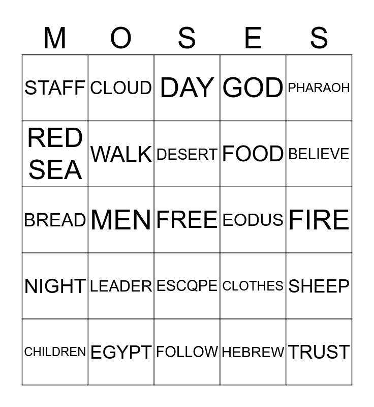 This bingo card has a free space and 26 words: ESCQPE, HEBREW, DESERT, EGYPT, PHARAOH, STAFF, RED SEA, CLOUD, FIRE, CLOTHES, FOOD, BREAD, SHEEP, CHILDREN, MEN, WOMEN, GOD, NIGHT, DAY, TRUST, BELIEVE, FOLLOW, EODUS, LEADER, WALK and PROTECT.