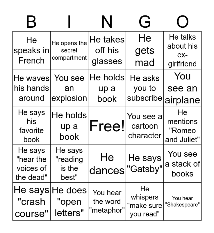 This bingo card has a free space and 29 words: He says "crash course", You hear the world "symbol", He holds up a book, He mentions the Bible, He speaks in French, He takes off his glasses, You see an explosion, He says "reading is the best", You see a cartoon character, He does "open letters", He mentions "Romeo and Juliet", You hear "Shakespeare", You hear the word "metaphor", He whispers "make sure you read", You see an airplane, You hear the word "hyperbole", He dances, He says "hear the voices of the dead", He talks about his ex-girlfriend, He says his favorite book, He says "Gatsby", He says "green light", He asks you to subscribe, He waves his hands around, He gets mad, He opens the secret compartment, You see a stack of books, He holds up a book and He changes outfits.