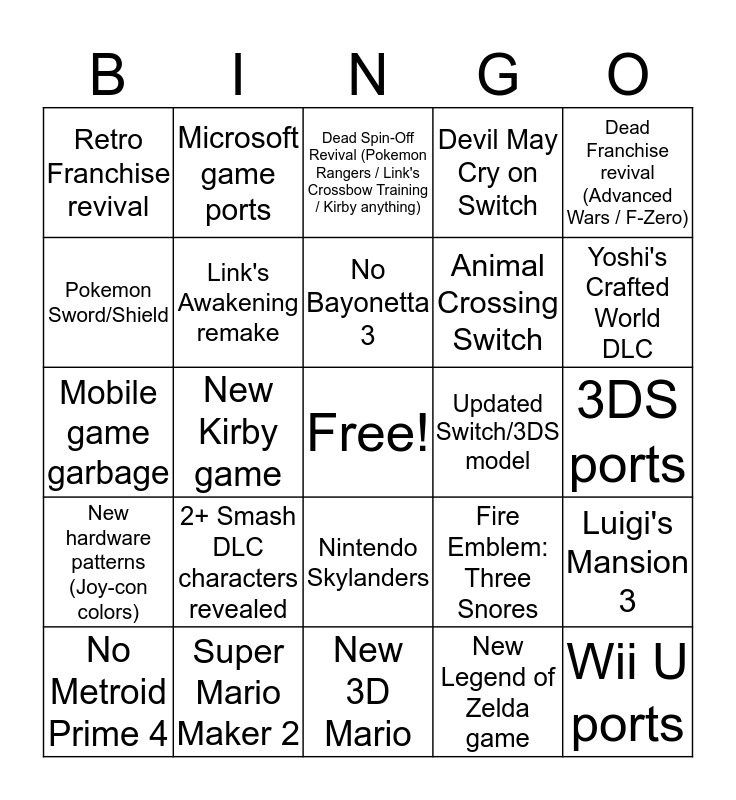 This bingo card has a free space and 24 words: 2+ Smash DLC characters revealed, Super Mario Maker 2, No Bayonetta 3, No Metroid Prime 4, Dead Franchise revival (Advanced Wars / F-Zero), Retro Franchise revival, Pokemon Sword/Shield, Microsoft game ports, Updated Switch/3DS model, Nintendo Skylanders, Animal Crossing Switch, Mobile game garbage, Fire Emblem: Three Snores, Luigi's Mansion 3, Link's Awakening remake, New Legend of Zelda game, 3DS ports, Dead Spin-Off Revival (Pokemon Rangers / Link's Crossbow Training / Kirby anything), Yoshi's Crafted World DLC, New Kirby game, Wii U ports, New hardware patterns (Joy-con colors), Devil May Cry on Switch and New 3D Mario.