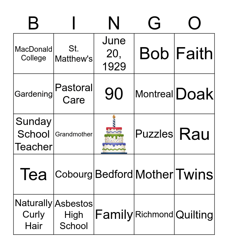 This bingo card has a free space and 29 words: Naturally Curly Hair, Teacher, Grandmother, Petticoat Lane, MacDonald College, June 20, 1929, Pastoral Care, Cobourg, Puzzles, Asbestos High School, Rau, Quilting, Family, Richmond, Doak, Knitting, Bedford, Tea, Faith, Sunday School Teacher, Mother, St. Peter's, Montreal, Gardening, Bob, St. Matthew's, Twins, 90 and Smile.