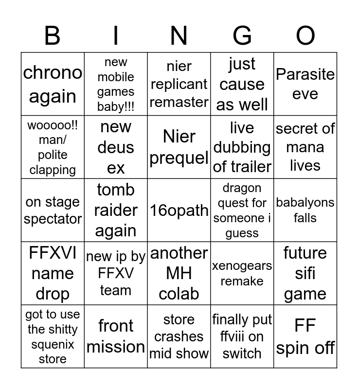 This bingo card has 36 words: KHIII actual dlc news, FFVII Tifa nerf/ berf, FFXIV trailer... no news, new deus ex, xenogears remake, FFXVI name drop, Nier prequel, KH mobile game, Parasite eve, Avengers game... live service, tomb raider again, just cause as well, Free!, dragon quest for someone i guess, secret of mana lives, chrono again, FF spin off, new ip by FFXV team, 16opath, nier replicant remaster, babalyons falls, future sifi game, front mission, got to use the shitty squenix store, store crashes mid show, new mobile games baby!!!, on stage spectator, celebrity bonus: ariana grande, live dubbing of trailer, wooooo!! man/ polite clapping, re-release of advent children, KH expand, finally put ffviii on switch, another MH colab, TWEWY anything please. and non-gaming cross branding?.