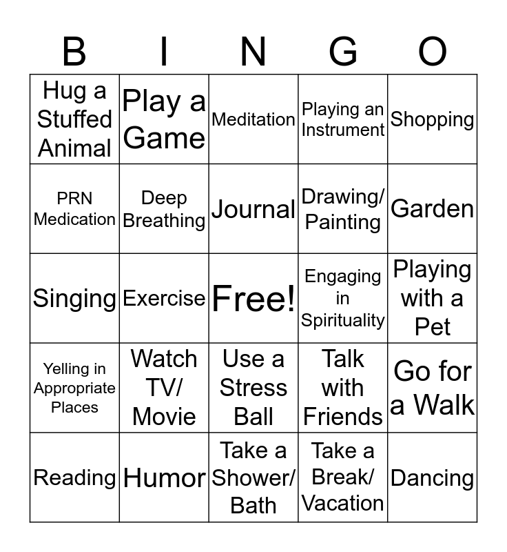 This bingo card has a free space and 24 words: Watch TV/ Movie, Humor, Journal, Reading, Shopping, Hug a Stuffed Animal, PRN Medication, Play a Game, Engaging in Spirituality, Use a Stress Ball, Drawing/ Painting, Singing, Talk with Friends, Go for a Walk, Deep Breathing, Take a Break/ Vacation, Playing with a Pet, Meditation, Garden, Exercise, Dancing, Yelling in Appropriate Places, Playing an Instrument and Take a Shower/ Bath.
