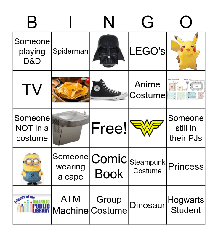This bingo card has 11 images, a free space and 18 words: Police Officer, Someone playing D&D, Someone wearing a cape, ATM Machine, Someone still in their PJs, Hogwarts Student, Group Costume, Dinosaur, Comic Book, Someone NOT in a costume, Steampunk Costume, Action Figure, Anime Costume, TV, LEGO's, Spiderman, Princess and Computer.