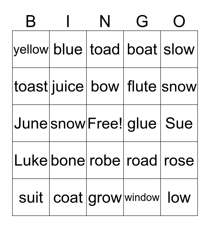 This bingo card has a free space and 24 words: bone, coat, bow, suit, slow, yellow, toast, blue, glue, robe, flute, June, road, rose, juice, window, Sue, toad, snow, snow, low, Luke, boat and grow.