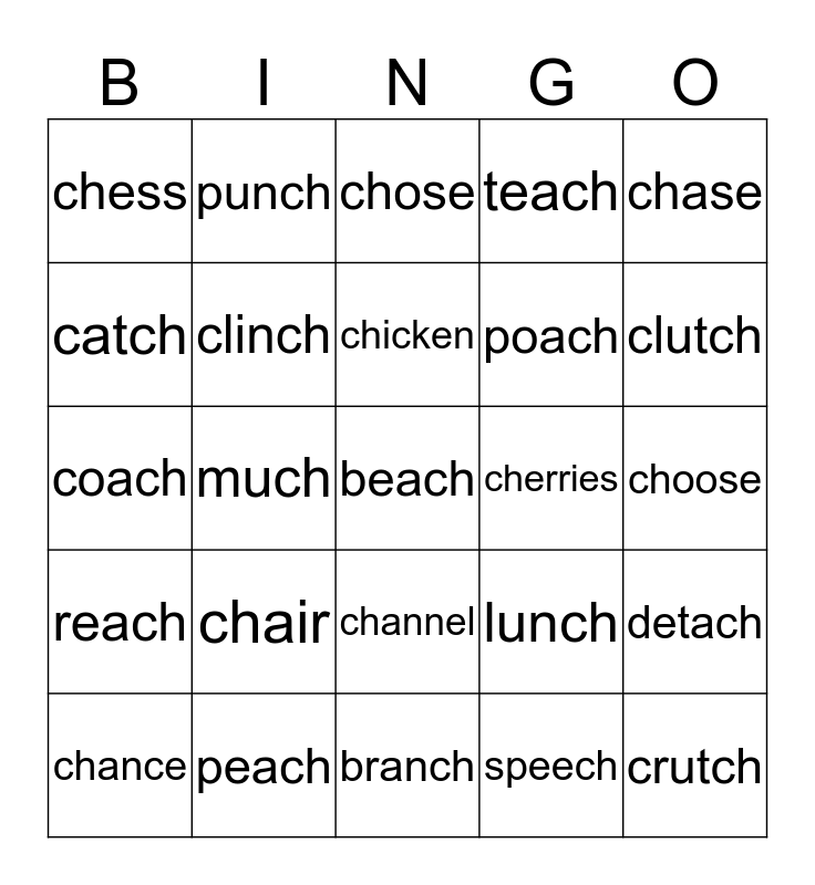 This bingo card has 25 words: chair, branch, chicken, chance, chase, chess, catch, punch, cherries, channel, poach, coach, lunch, detach, clinch, crutch, choose, chose, clutch, much, beach, peach, reach, teach and speech.