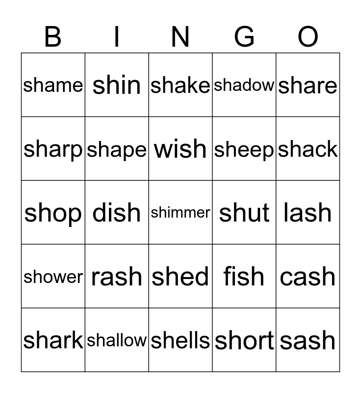 This bingo card has 25 words: rash, shells, wish, shark, share, shame, sharp, shin, shut, shed, sheep, shop, fish, cash, shape, sash, lash, shake, shack, dish, shimmer, shallow, shower, shadow and short.