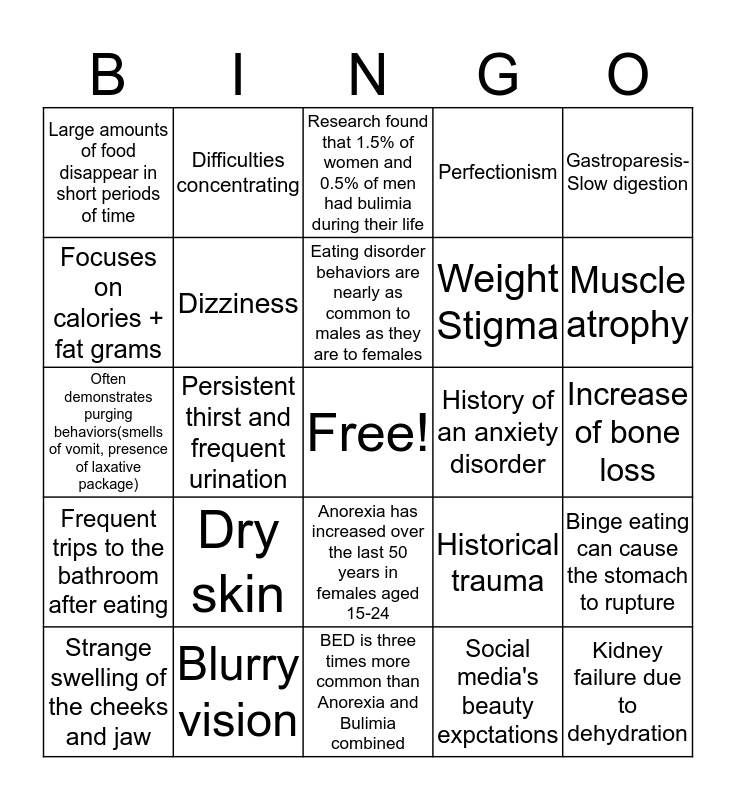 This bingo card has a free space and 69 words: Dramatic weight loss, Dizziness, Having a close relative with an eating disorder, Loss of menstrual cycle, Young people aged between 15-24 with anorexia have a 10x increased chance of dying, History of dieting, Gastroparesis- Slow digestion, Dry skin, Weight Stigma, Being bullied can put you at risk of developing Anorexia, Kidney failure due to dehydration, Strong need for control, Perfectionism, Eating disorder behaviors are nearly as common to males as they are to females, Negative energy balance, Increase of bone loss, Focuses on calories + fat grams, Anorexia has increased over the last 50 years in females aged 15-24, Feeling of dissatisfaction with one's body, Historical trauma, Mortality rate of Anorexia is 4.0%, Social media's beauty expctations, History of an anxiety disorder, Core body temperature will drop and hypothermia may develop, Frequent trips to the bathroom after eating, Feeling alone or secluded from others, Electrolyte imbalances can lead to irregular heartbeats, possibly heart failure and death, Bulimia occurs in 2.0% to 5.4% of adolescent females, Individuals with type 1 (insulin-dependent) diabetes, Extreme mood swings, Research found that 1.5% of women and 0.5% of men had bulimia during their life, Tendency to follow FAD diets, Blocked intestines form from solid masses of undigested foods, The mortality rate for bulimia is 3.9%, Stomach pains and bloating, Strange swelling of the cheeks and jaw, Almost half of patients diagnosed with Bulimia also have a mood disorder, Often demonstrates purging behaviors(smells of vomit, presence of laxative package), Difficulties concentrating, 1 in 5 anorexia deaths occur by suicide, Binge eating can cause the stomach to rupture, 50 to 80 percent of the risk for anorexia is genetic, Vomiting can cause the esophagus to rupture, Blurry vision, Approximately 40% of binge eating disorder diagnostics are male, Persistent thirst and frequent urination, 3 out of 10 individuals looking to lose weight show signs of BED, develops feelings of guilt, depression, and disgust due to overeating, Low sodium or potassium, BED is three times more common than Anorexia and Bulimia combined, Large amounts of food disappear in short periods of time, Weight gain and obesity, Binge eating disorder occurs in 1.6% of adolescent females, Yeast infection, Restriction of certain foods or food groups to lower insulin levels, 8 percent of American adults suffer from binge eating disorder in their lifetime, Diabetic Ketoacidosis, Neglect of diabetes management, 1/3 of female patients and 1/6 of male patients with Type 1 diabetes reported disordered eating and frequent insulin restriction, Muscle atrophy, Research, shows that 30%-35% of women restrict insulin in order to lose weight at some point in their life, 16 percent of males with type 1 diabetes have disordered eating behaviors, Peripheral Neuropathy, Compulsive checking of ingredient lists and nutritional labels, Girls who diet frequently are 12 times as likely to binge compared to girls who don’t diet, High levels of distress when healthy foods are not available, Orthorexia rates are twice as high in females compared to males, Risk of developing substance abuse and addiction and Mortality rate of 5.2% for eating disorders that are not specified.