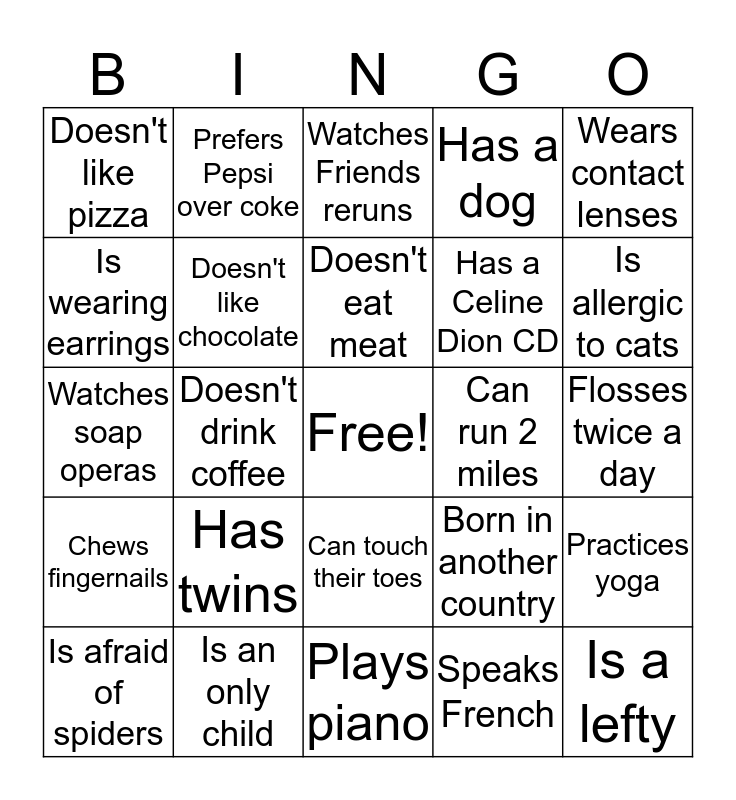 This bingo card has a free space and 29 words: Is afraid of spiders, Loves to bake cookies, Doesn't drink coffee, Has a tattoo, Doesn't like pizza, Watches Friends reruns, Doesn't like chocolate, Has twins, Can run 2 miles, Is an only child, Flosses twice a day, Is a lefty, Plays piano, Speaks French, Is allergic to cats, Played on a volleyball team, Can touch their toes, Chews fingernails, Wears contact lenses, Watches soap operas, Born in another country, Is younger than you, Has a Celine Dion CD, Is wearing earrings, Has a dog, Prefers Pepsi over coke, Practices yoga, Doesn't eat meat and Likes chick flicks.