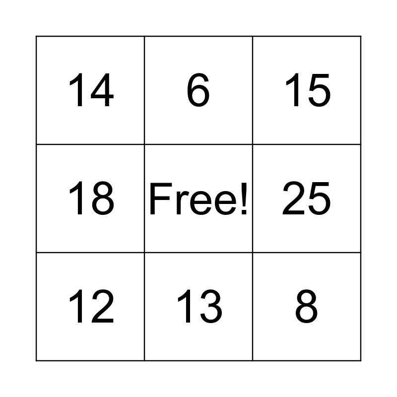 This bingo card has a free space and 9 words: 12, 15, 6, 18, 14, 25, 8, 4 and 13.
