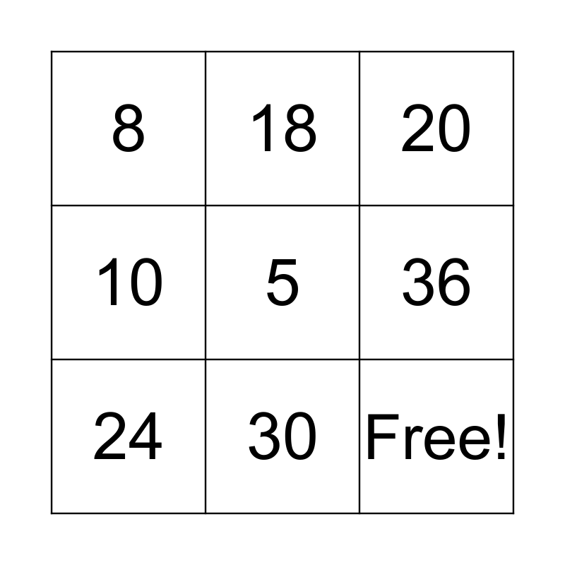 This bingo card has a free space and 9 words: 24, 20, 18, 10, 8, 36, Free!, 15 and 30.