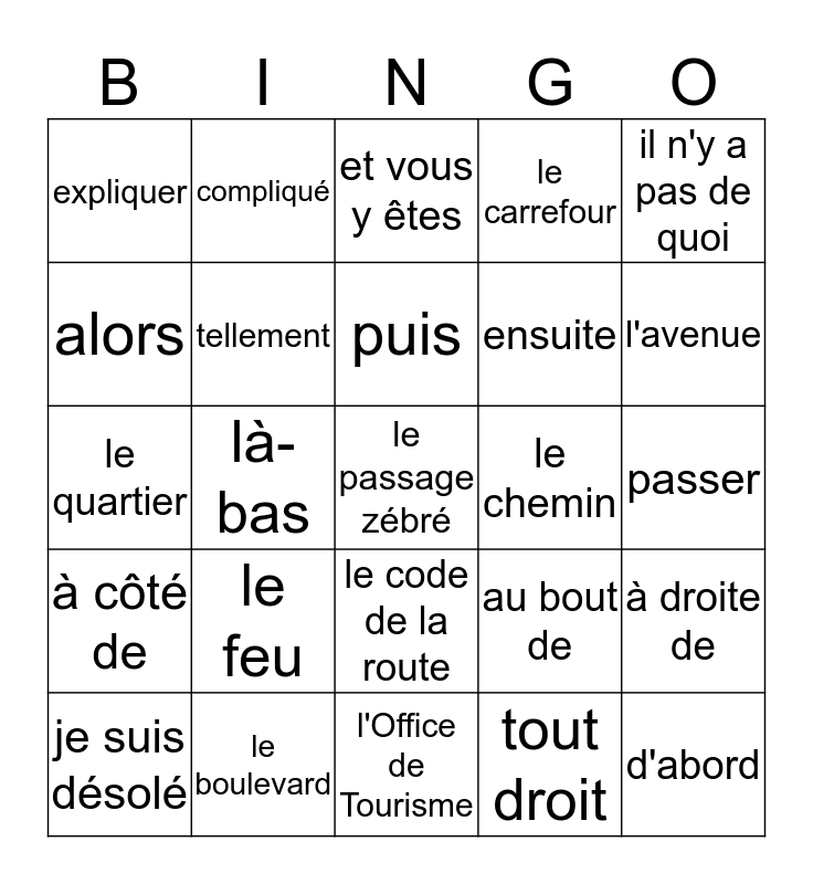 This bingo card has 44 words: le panneau, le passage zébré, excusez-moi, je suis désolé, voyons, tout droit, et vous y êtes, merci mille fois, il n'y a pas de quoi, le boulevard, le carrefour, le chemin, le code de la route, le feu, l'hôtel de ville, l'Office de Tourisme, le pont, le quartier, le rond-point, l'avenue, compliqué, piéton, continuer, expliquer, indiquer, passer, tourner, traverser, au bout de, à côté de, à gauche de, à droite de, en face de, jusque/ jusqu'à, là-bas, loin de, près de, d'abord, puis, alors, ensuite, enfin, tellement and pardon.