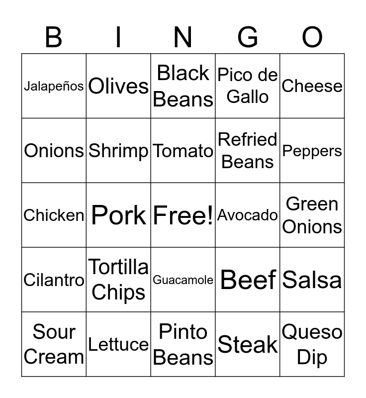 This bingo card has a free space and 24 words: Tortilla Chips, Lettuce, Tomato, Sour Cream, Cheese, Jalapeños, Onions, Olives, Avocado, Guacamole, Refried Beans, Chicken, Beef, Salsa, Shrimp, Steak, Green Onions, Black Beans, Peppers, Pork, Queso Dip, Cilantro, Pico de Gallo and Pinto Beans.