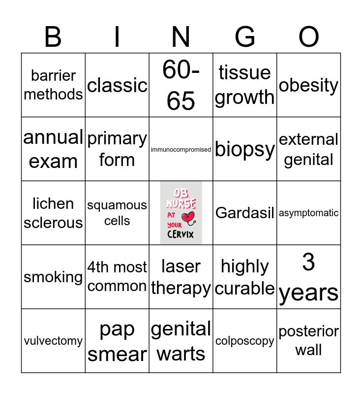 This bingo card has a free space and 34 words: uterine cervix, HPV, painless vaginal bleeding, abnormal changes in cells, asymptomatic, annual exam, primary form, genital warts, biopsy, posterior wall, lichen sclerous, classic, colposcopy, simplex, smoking, squamous cells, laser therapy, Gardasil, 3 years, vulvectomy, pap smear, 26, tissue growth, external genital, 3 doses, 4th most common, 60-65, radiation, obesity, barrier methods, weight loss, immunocompromised, highly curable and early treatment.