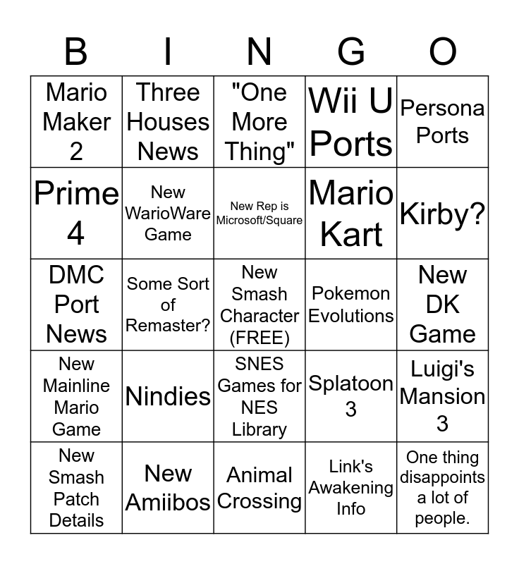 This bingo card has a free space and 24 words: Nindies, New Amiibos, New Rep is Microsoft/Square, New Smash Patch Details, Persona Ports, Mario Maker 2, Prime 4, Three Houses News, Pokemon Evolutions, SNES Games for NES Library, Mario Kart, DMC Port News, Splatoon 3, Luigi's Mansion 3, New WarioWare Game, Link's Awakening Info, New DK Game, "One More Thing", Kirby?, Some Sort of Remaster?, One thing disappoints a lot of people., New Mainline Mario Game, Wii U Ports and Animal Crossing.