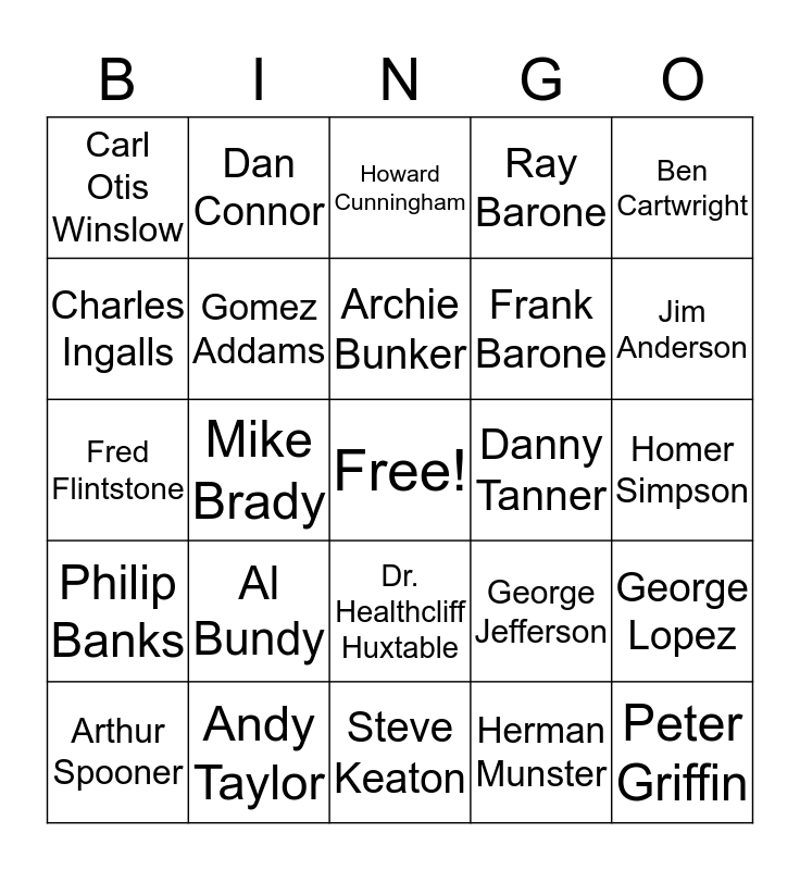 This bingo card has a free space and 24 words: Al Bundy, Andy Taylor, Archie Bunker, Arthur Spooner, Ben Cartwright, Carl Otis Winslow, Charles Ingalls, Dan Connor, Danny Tanner, Dr. Healthcliff Huxtable, Frank Barone, Fred Flintstone, George Jefferson, George Lopez, Gomez Addams, Herman Munster, Homer Simpson, Howard Cunningham, Jim Anderson, Mike Brady, Peter Griffin, Philip Banks, Ray Barone and Steve Keaton.