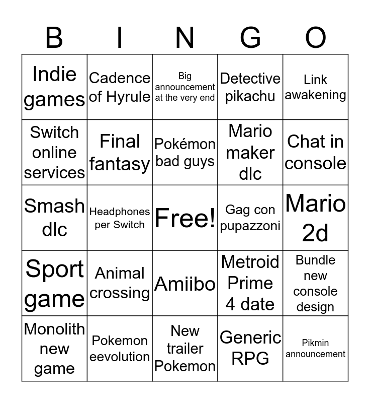 This bingo card has a free space and 24 words: Animal crossing, Pokemon eevolution, Pokémon bad guys, Monolith new game, Link awakening, Indie games, Switch online services, Cadence of Hyrule, Gag con pupazzoni, Amiibo, Mario maker dlc, Smash dlc, Metroid Prime 4 date, Bundle new console design, Final fantasy, Generic RPG, Mario 2d, Big announcement at the very end, Chat in console, Headphones per Switch, Pikmin announcement, Sport game, Detective pikachu and New trailer Pokemon.