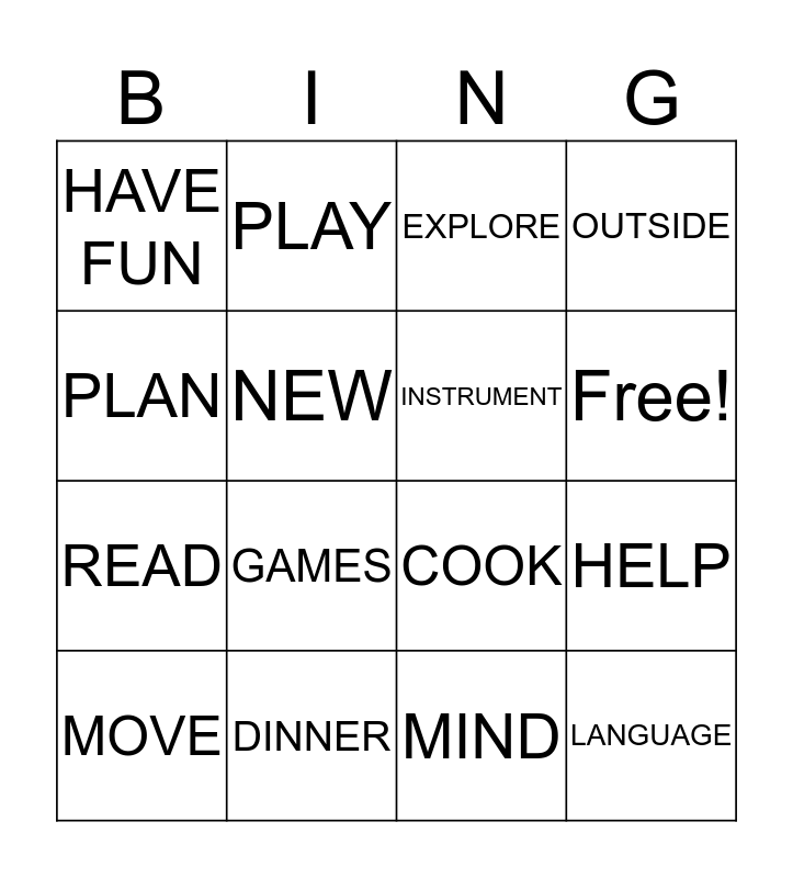 This bingo card has 17 words: MIND, MOVE, EXPLORE, HAVE FUN, GAMES, OUTSIDE, HELP, INSTRUMENT, Free!, NEW, DINNER, COOK, PLAN, PLAY, READ, JOURNAL and LANGUAGE.
