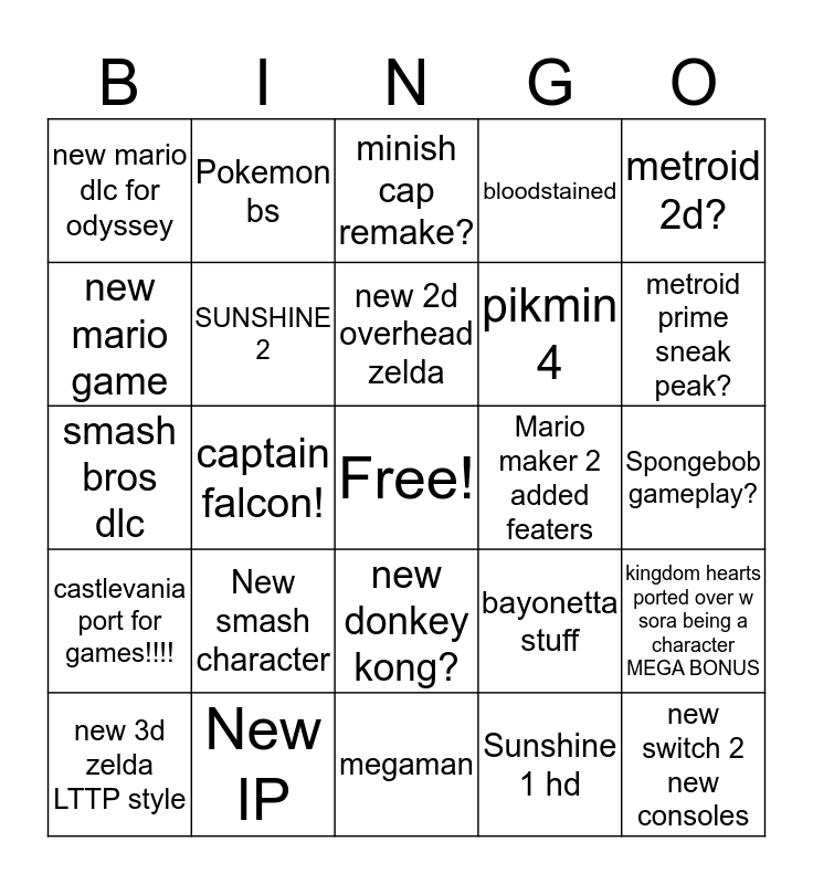 This bingo card has a free space and 24 words: New smash character, New IP, new 2d overhead zelda, new 3d zelda LTTP style, metroid 2d?, new mario dlc for odyssey, new mario game, Pokemon bs, Mario maker 2 added featers, new donkey kong?, pikmin 4, smash bros dlc, bayonetta stuff, kingdom hearts ported over w sora being a character MEGA BONUS, SUNSHINE 2, Sunshine 1 hd, Spongebob gameplay?, minish cap remake?, metroid prime sneak peak?, captain falcon!, new switch 2 new consoles, castlevania port for games!!!!, bloodstained and megaman.