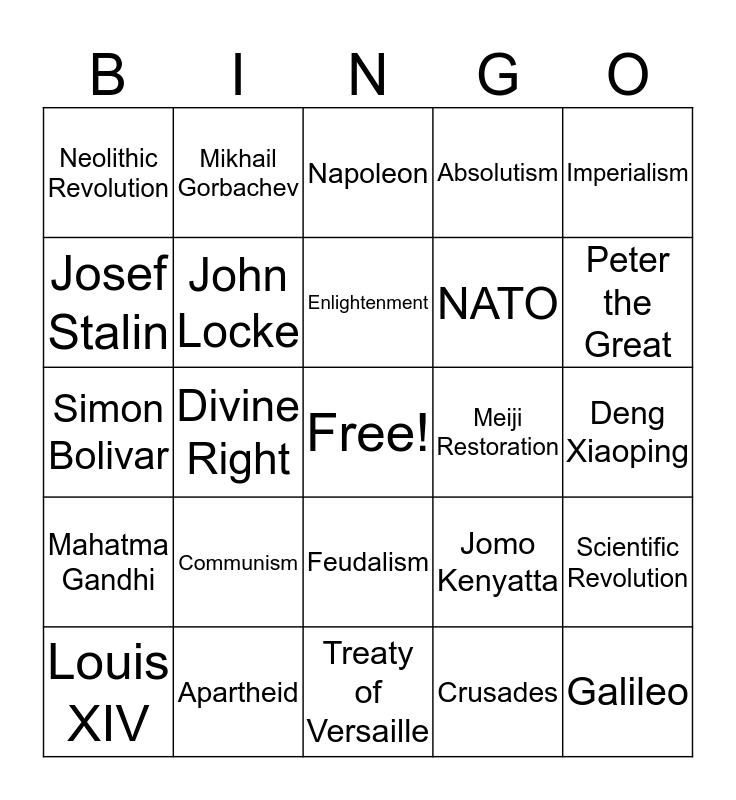 This bingo card has a free space and 34 words: Karl Marx, Crusades, Martin Luther, Renaissance, Mahatma Gandhi, John Locke, Imperialism, Louis XIV, Mikhail Gorbachev, Cold War, Enlightenment, Napoleon, Laissez-fair, Ho Chi Mihn, Meiji Restoration, Peter the Great, Apartheid, Simon Bolivar, Communism, Jomo Kenyatta, Feudalism, Nelson Mandela, Neolithic Revolution, Deng Xiaoping, Treaty of Versaille, Galileo, Absolutism, Mao Zedong, NATO, Josef Stalin, Cultural Diffusion, Divine Right, Scientific Revolution and Containment.