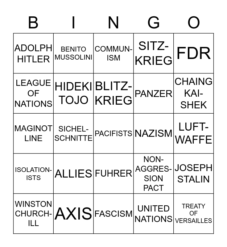 This bingo card has a free space and 24 words: ALLIES, AXIS, BLITZ- KRIEG, WINSTON CHURCH- ILL, FDR, ADOLPH HITLER, LEAGUE OF NATIONS, BENITO MUSSOLINI, NAZISM, FUHRER, PANZER, MAGINOT LINE, NON- AGGRES- SION PACT, JOSEPH STALIN, HIDEKI TOJO, UNITED NATIONS, LUFT- WAFFE, COMMUN- ISM, CHAING KAI-SHEK, SICHEL- SCHNITTE, TREATY OF VERSAILLES, ISOLATION-ISTS, SITZ- KRIEG and FASCISM.