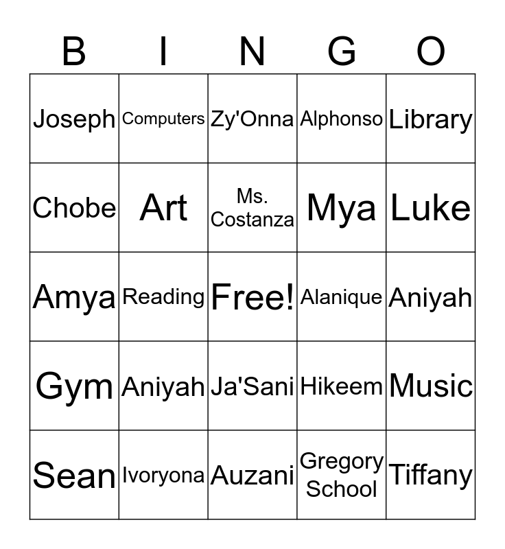 This bingo card has a free space and 32 words: Gregory School, Math, Reading, Science, Gym, Art, Library, Music, Computers, Ms. Harris, Ms. Costanza, Zy'Onna, Genesis, Tinnie, Alanique, Zy'Quay, Sean, Amya, Ja'Sani, Aniyah, Hikeem, Lisa, Aniyah, Ivoryona, Tiffany, Alphonso, Mya, Chobe, Joseph, Auzani, Laurent and Luke.