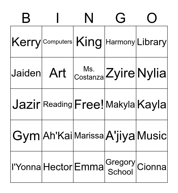 This bingo card has a free space and 32 words: Gregory School, Math, Reading, Science, Gym, Art, Library, Music, Computers, Ms. Harris, Ms. Costanza, King, Iversen, Teyona, Makyla, Arkain, I'Yonna, Jazir, Marissa, Ah'Kai, A'jiya, Anyla, Kayla, Hector, Cionna, Harmony, Zyire, Jaiden, Kerry, Emma, Raymond and Nylia.