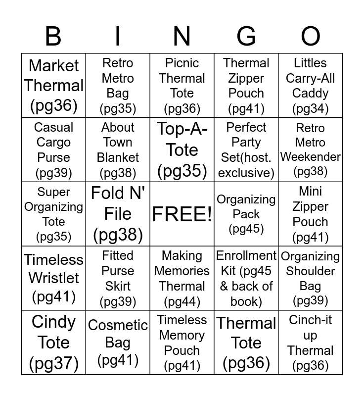 This bingo card has a free space and 24 words: Fitted Purse Skirt (pg39), Cosmetic Bag (pg41), Top-A-Tote (pg35), Cindy Tote (pg37), Littles Carry-All Caddy (pg34), Market Thermal (pg36), Casual Cargo Purse (pg39), Retro Metro Bag (pg35), Organizing Pack (pg45), Making Memories Thermal (pg44), Perfect Party Set(host. exclusive), Super Organizing Tote (pg35), Enrollment Kit (pg45 & back of book), Organizing Shoulder Bag (pg39), About Town Blanket (pg38), Thermal Tote (pg36), Mini Zipper Pouch (pg41), Picnic Thermal Tote (pg36), Retro Metro Weekender (pg38), Fold N' File (pg38), Cinch-it up Thermal (pg36), Timeless Wristlet (pg41), Thermal Zipper Pouch (pg41) and Timeless Memory Pouch (pg41).