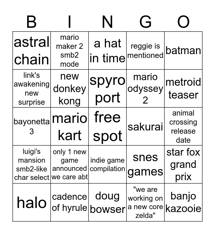 This bingo card has a free space and 24 words: only 1 new game announced we care abt, cadence of hyrule, spyro port, halo, batman, astral chain, link's awakening new surprise, mario maker 2 smb2 mode, sakurai, indie game compilation, mario odyssey 2, bayonetta 3, snes games, star fox grand prix, new donkey kong, "we are working on a new core zelda", animal crossing release date, a hat in time, metroid teaser, mario kart, banjo kazooie, luigi's mansion smb2-like char select, reggie is mentioned and doug bowser.