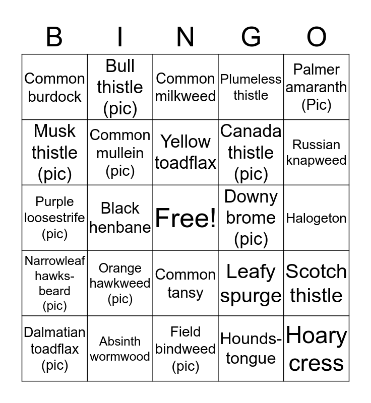 This bingo card has a free space and 30 words: Absinth wormwood, Baby's breathe (pic), Black henbane, False chamomile, Common burdock, Common milkweed, Common mullein (pic), Common tansy, Downy brome (pic), Field bindweed (pic), Halogeton, Hoary cress, Hounds-tongue, Diffuse knapweed (pic), Russian knapweed, Kochia, Leafy spurge, Narrowleaf hawks-beard (pic), Orange hawkweed (pic), Palmer amaranth (Pic), Purple loosestrife (pic), Saltcedar, Bull thistle (pic), Canada thistle (pic), Musk thistle (pic), Plumeless thistle, Scotch thistle, Dalmatian toadflax (pic), Yellow toadflax and Yellow starthistle (pic).