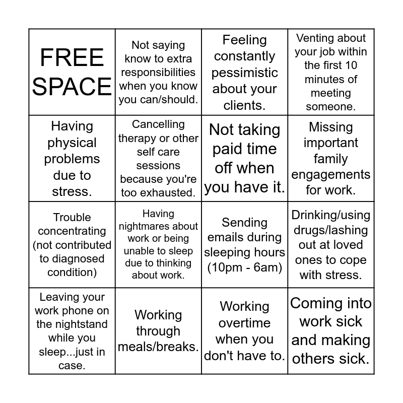 This bingo card has 16 words: Working through meals/breaks., Drinking/using drugs/lashing out at loved ones to cope with stress., Feeling constantly pessimistic about your clients., FREE SPACE, Trouble concentrating (not contributed to diagnosed condition), Not saying know to extra responsibilities when you know you can/should., Sending emails during sleeping hours (10pm - 6am), Working overtime when you don't have to., Having physical problems due to stress., Cancelling therapy or other self care sessions because you're too exhausted., Leaving your work phone on the nightstand while you sleep...just in case., Venting about your job within the first 10 minutes of meeting someone., Having nightmares about work or being unable to sleep due to thinking about work., Missing important family engagements for work., Not taking paid time off when you have it. and Coming into work sick and making others sick..