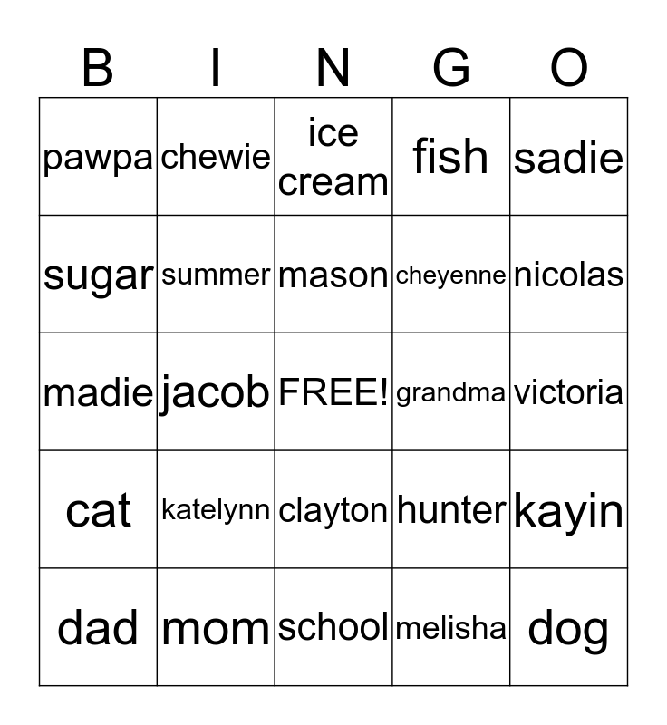This bingo card has a free space and 24 words: katelynn, mom, mason, dad, sadie, pawpa, sugar, chewie, grandma, clayton, cheyenne, madie, hunter, kayin, summer, melisha, victoria, ice cream, nicolas, jacob, dog, cat, fish and school.
