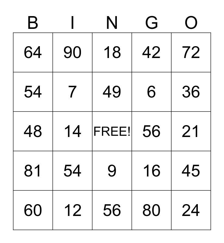 This bingo card has a free space and 24 words: 54, 12, 49, 60, 72, 64, 54, 90, 56, 9, 6, 48, 16, 45, 7, 80, 21, 18, 36, 14, 24, 81, 42 and 56.