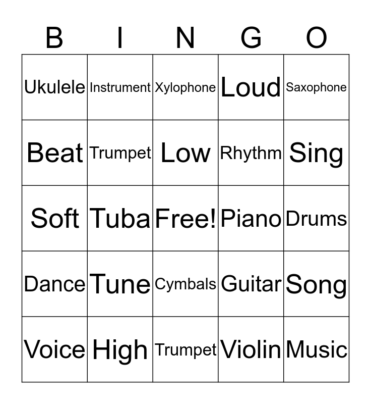 This bingo card has a free space and 31 words: Trumpet, Clarinet, Tuba, Flute, Ukulele, Xylophone, Trumpet, Guitar, Piano, Violin, Drums, Music, Harp, Bells, Sing, Banjo, Song, Tune, Dance, Cymbals, Saxophone, Concert, Voice, Instrument, Rhythm, Beat, Loud, Soft, High, Low and Melody.