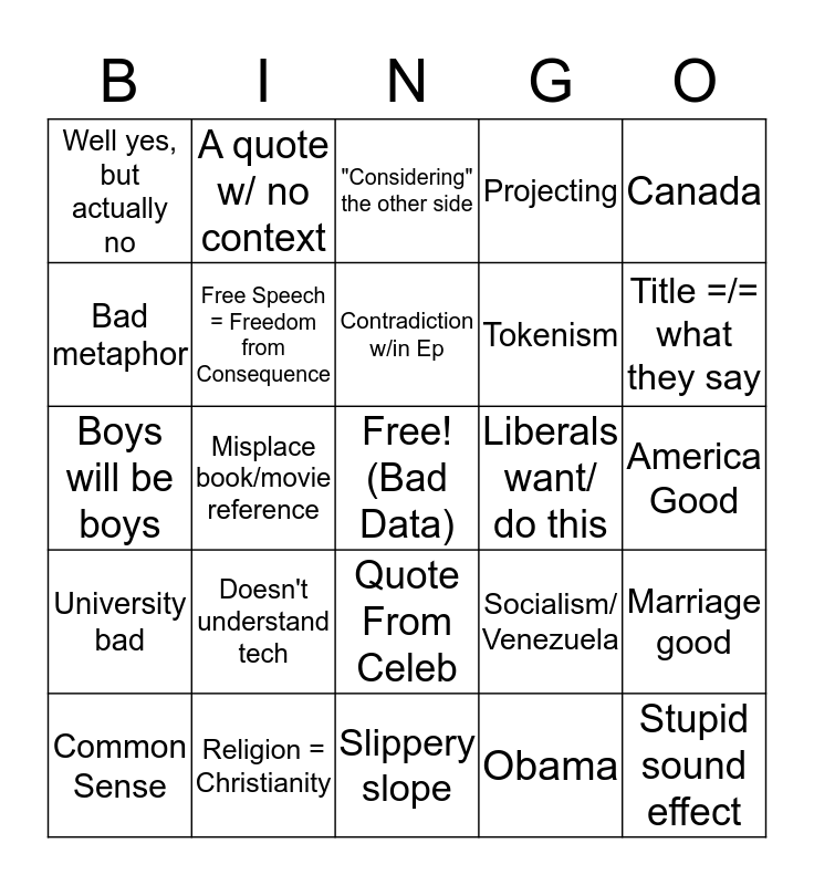 This bingo card has a free space and 27 words: Socialism/ Venezuela, "Just do this", Tokenism, Slippery slope, Bad metaphor, "Considering" the other side, A quote w/ no context, University bad, Liberals want/ do this, Marriage good, Boys will be boys, Projecting, Common Sense, Religion = Christianity, Title =/= what they say, No Father, Free Speech = Freedom from Consequence, Contradiction w/in Ep, Doesn't understand tech, Well yes, but actually no, America Good, Obama, Misplace book/movie reference, Stupid sound effect, Quote From Celeb, Canada and Incel thing.