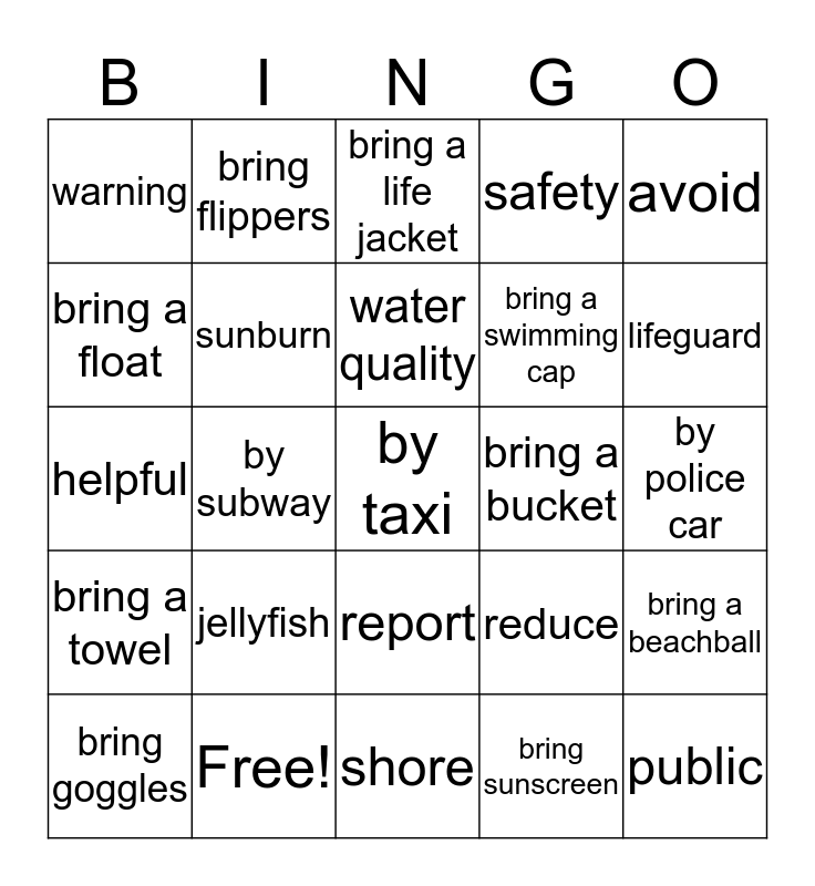 This bingo card has 28 words: bring a beachball, bring sunglasses, bring a swimming cap, bring sunscreen, bring a float, bring a life jacket, bring flippers, bring a towel, bring a bucket, bring goggles, helpful, safety, Free!, shore, lifeguard, surf, jellyfish, sunburn, water quality, report, warning, public, by taxi, by subway, by police car, reduce, avoid and by ice cream truck.