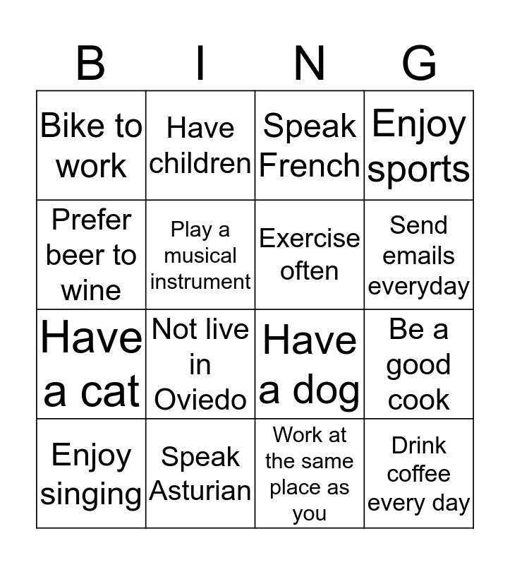 This bingo card has 28 words: Have a sister, Enjoy reading, Have a cat, Listen to classical music, Play a musical instrument, Speak French, Have children, Drink coffee every day, Speak Asturian, Read the newspaper everyday, Have a dog, Enjoy sports, Enjoy traveling, Have a brother, Not live in Oviedo, Be an only child, Write poetry, Exercise often, Send emails everyday, Drive to work, Bike to work, Have a bird, Enjoy singing, Be a good cook, Work at the same place as you, Like going the beach, Prefer beer to wine and not like cider.