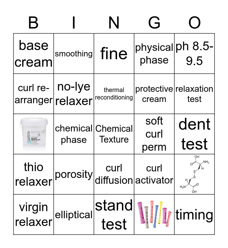 This bingo card has 5 images, a free space and 34 words: sodium hydroxide, ammmonium thioglycolate, neutralizing shampoo, no-lye relaxer, virgin relaxer, curl diffusion, thermal reconditioning, ph 11.5-14, ph 8.5-9.5, thio relaxer, chemical phase, physical phase, timing, dent test, soft curl perm, porosity, elasticity, base cream, Madam CJ Walker, curl activator, curl re-arranger, stand test, protective cream, relaxation test, straight, zonal relaxer, resistant, non-resistant, bisulfate, smoothing, density, coarse, fine and elliptical.
