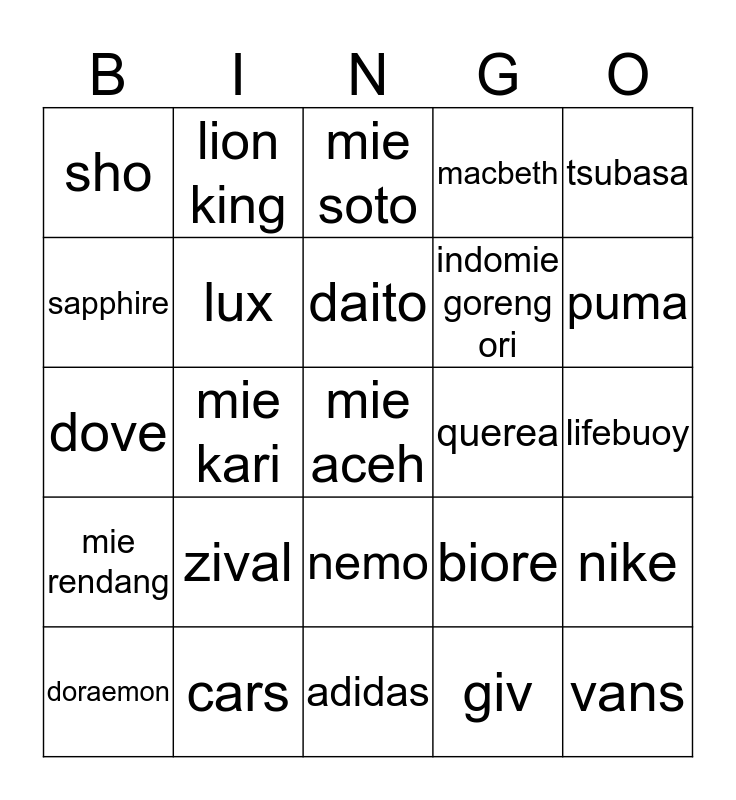 This bingo card has a free space and 24 words: zival, cars, daito, doraemon, tsubasa, sho, sapphire, lion king, querea, nemo, indomie goreng ori, dove, biore, nike, lux, giv, lifebuoy, mie soto, puma, mie kari, vans, mie rendang, macbeth and adidas.