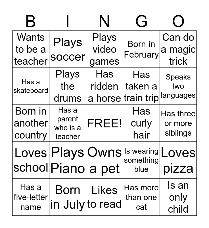 This bingo card has a free space and 24 words: Plays Piano, Born in July, Has ridden a horse, Has a five-letter name, Can do a magic trick, Wants to be a teacher, Has a skateboard, Plays soccer, Has curly hair, Owns a pet, Has taken a train trip, Born in another country, Is wearing something blue, Loves pizza, Plays the drums, Has more than one cat, Has three or more siblings, Plays video games, Speaks two languages, Has a parent who is a teacher, Is an only child, Loves school, Born in February and Likes to read.