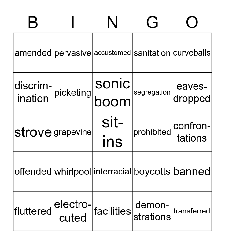 This bingo card has a free space and 24 words: whirlpool, electro- cuted, sonic boom, fluttered, curveballs, amended, discrim-ination, pervasive, prohibited, interracial, segregation, strove, boycotts, banned, picketing, demon-strations, confron- tations, accustomed, eaves-dropped, grapevine, transferred, offended, sanitation and facilities.