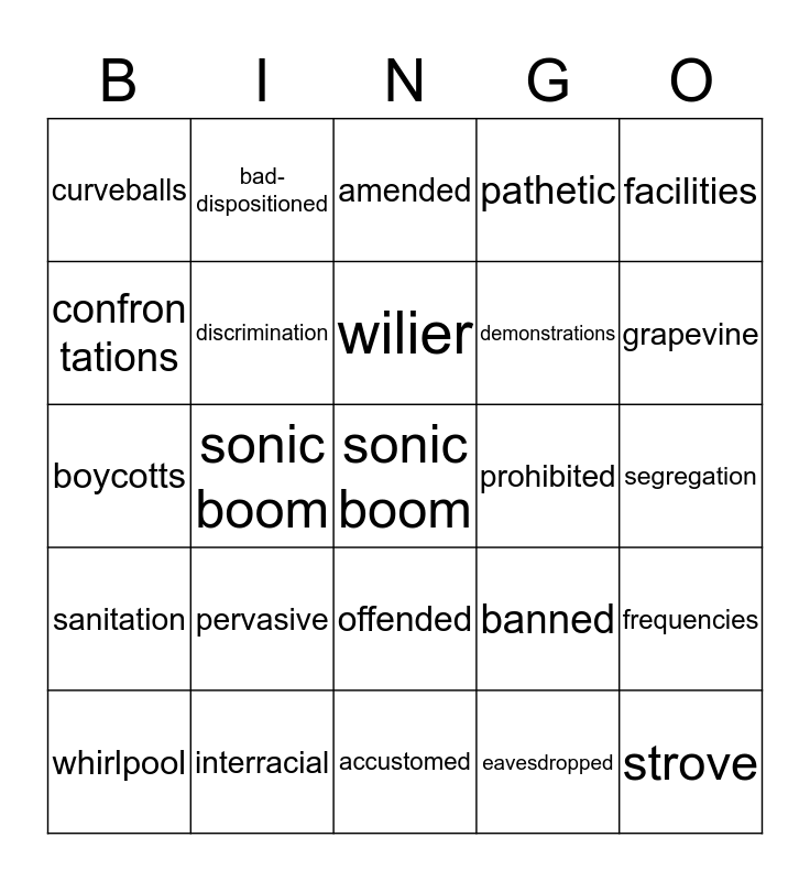 This bingo card has a free space and 29 words: whirlpool, electrocuted, sonic boom, fluttered, curveballs, amended, discrimination, pervasive, prohibited, interracial, segregation, strove, accustomed, eavesdropped, grapevine, transferred, offended, sanitation, facilities, boycotts, banned, picketing, demonstrations, confron tations, pathetic, bad-dispositioned, frequencies, wilier and scolding.